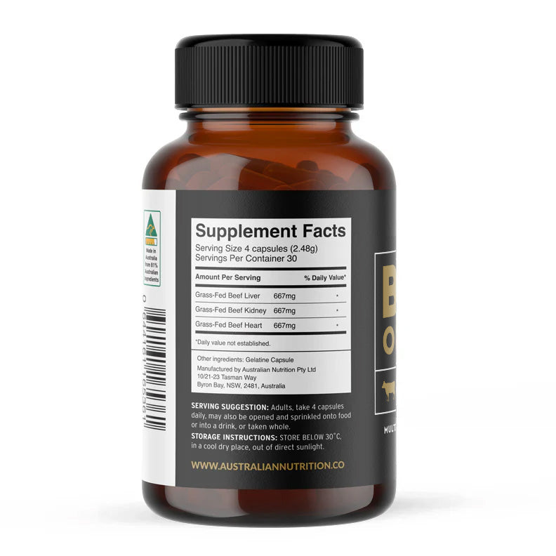 Ingredients: 83% Australian Beef Organs [Beef Liver 166mg, Beef Kidney 166mg, Beef Heart 167mg] 500mg), 17% Bovine Gelatin Capsule (120mg)